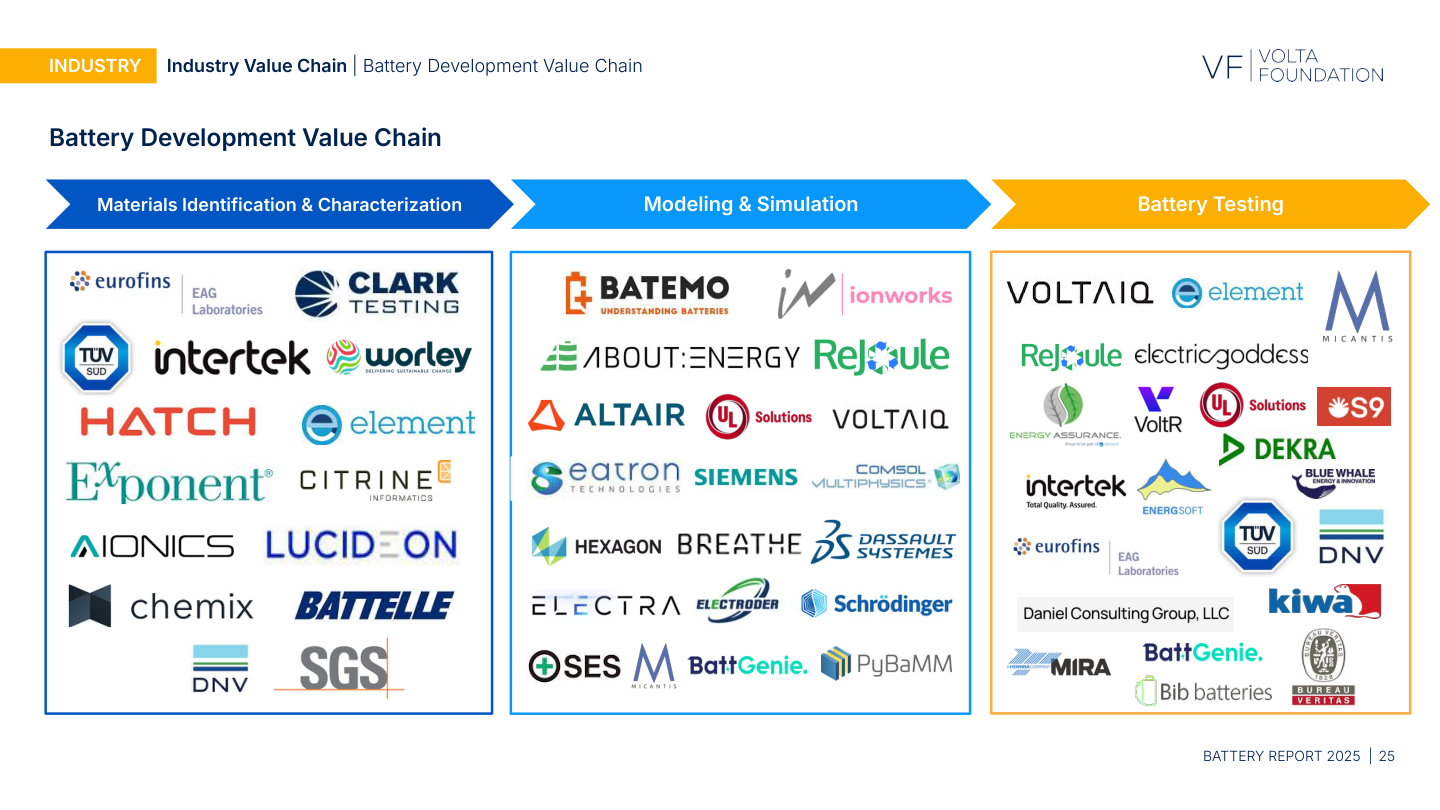 This is new. Prior editions of the Battery Report treated software as a supporting topic. The 2025 edition places it alongside cell design, manufacturing, and applications as a primary dimension of the industry. The "Battery Development Value Chain" diagram (p. 25) maps three activities at the core of battery development: Materials Identification, Modeling & Simulation, and Battery Testing.