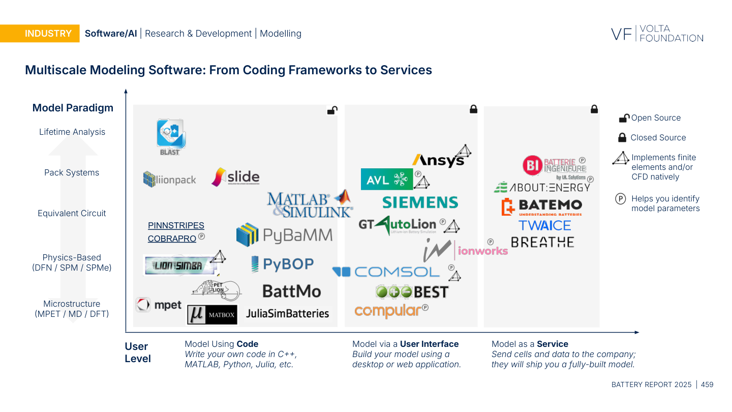 The 2025 edition includes a dedicated Software/AI section (pages 456 to 484) that covers the full software stack across the battery lifecycle: R&D data infrastructure, multiscale modeling tools (from DFN and SPM to pack-level thermal models), manufacturing analytics, BMS, field analytics, EMS, and BESS optimization.