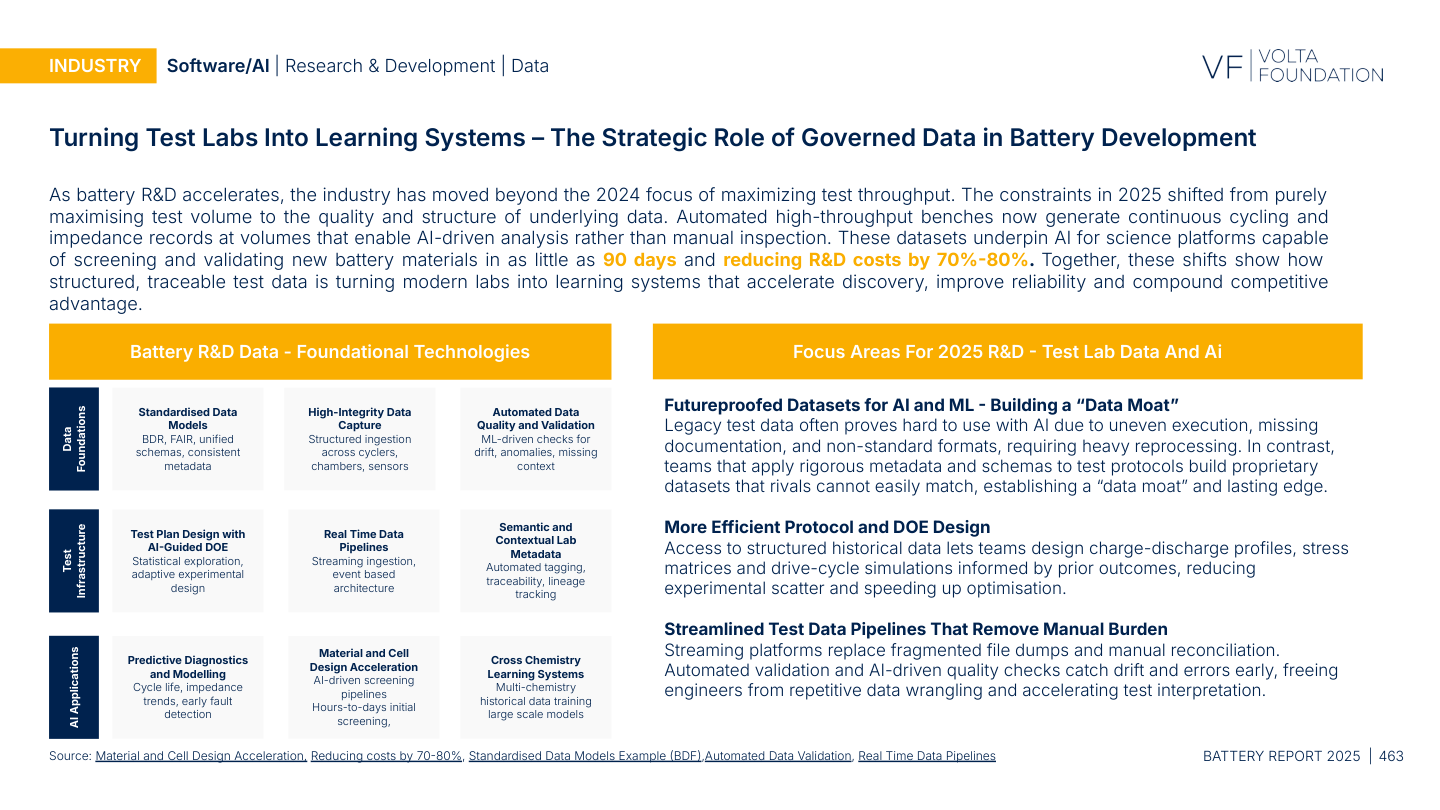 The report introduces "data moat" language: "Teams that apply rigorous metadata and schemas to test protocols build proprietary datasets that rivals cannot easily match, establishing a lasting edge." It lays out a stack of foundational technologies for R&D data: standardized data models and schemas, high-integrity data capture across cycler formats, automated data quality and validation, semantic and contextual lab metadata (traceability, lineage), and predictive diagnostics built on top.