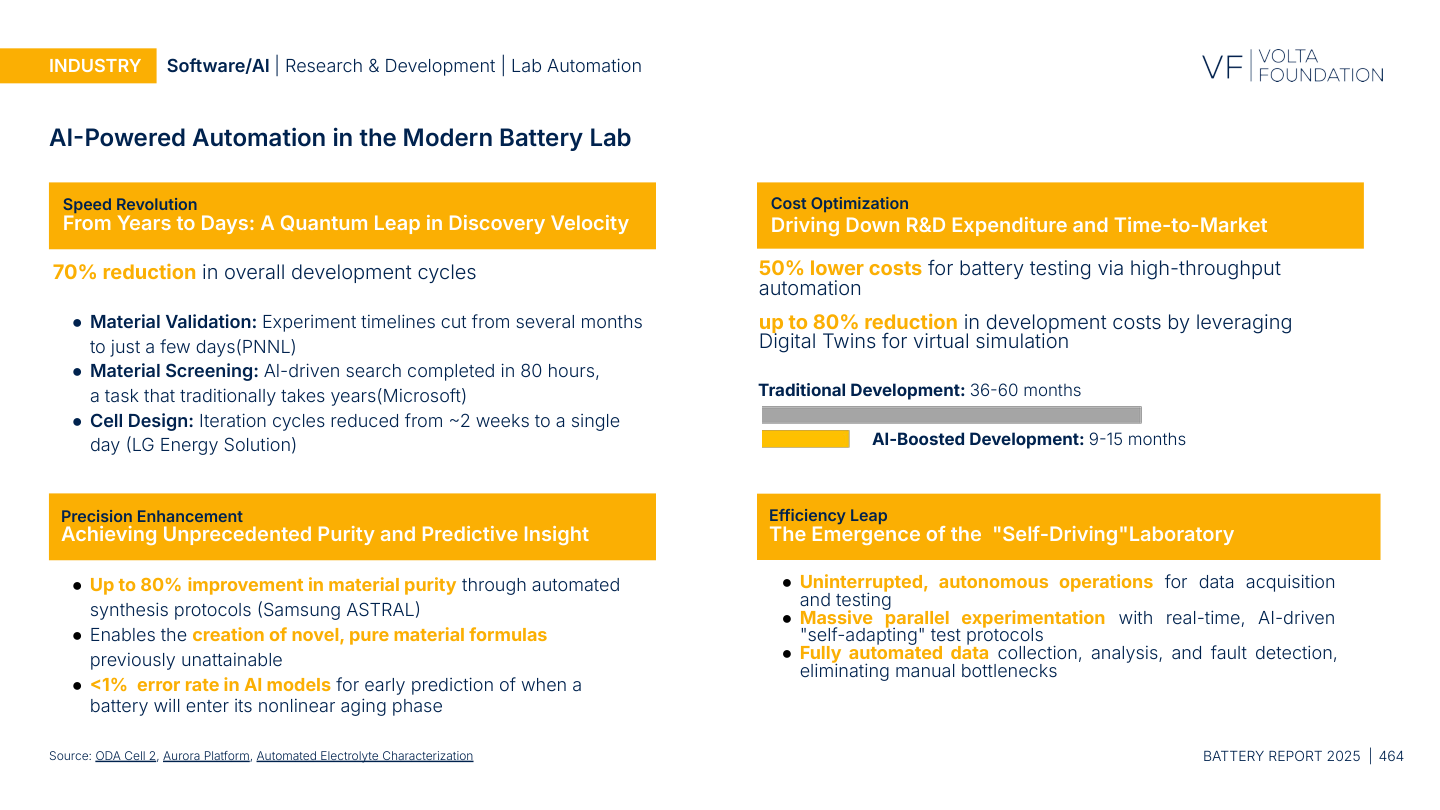 70% reduction in overall development cycles. Material validation timelines compressed from months to days (PNNL). AI-driven material screening completed in 80 hours for tasks that traditionally take years (Microsoft). Cell design iteration cycles reduced from two weeks to a single day (LG Energy Solution). Up to 80% reduction in development costs through digital twins. Traditional battery development: 36 to 60 months. AI-boosted development: 9 to 15 months.