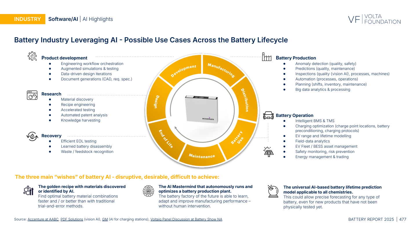 A separate page (p. 477) lists "engineering workflow orchestration" and "augmented simulations & testing" as key AI applications in product development. The three "wishes" the report identifies for battery AI: an AI-discovered golden recipe for materials, an autonomous factory, and a universal lifetime prediction model applicable to all chemistries.