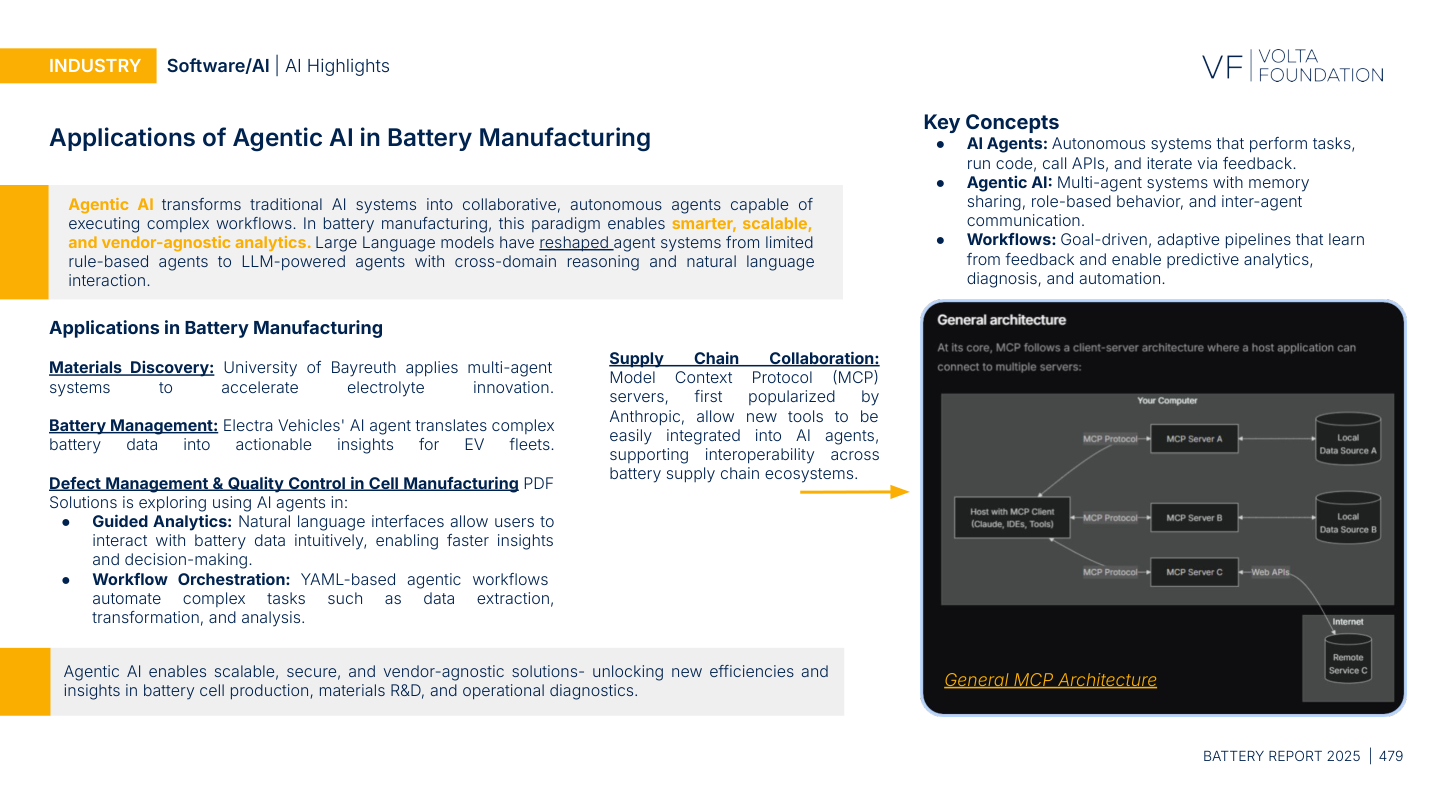 The report devotes a full page (p. 479) to agentic AI in battery manufacturing and R&D. It describes multi-agent systems for electrolyte innovation (University of Bayreuth), AI agents translating battery data into actionable insights (Electra Vehicles), and YAML-based agentic workflows for automated data extraction and analysis (PDF Solutions). Separately, the report highlights AI-driven detection of lithium plating during fast charging (p. 474) and SEI-related degradation modeling as active application areas.