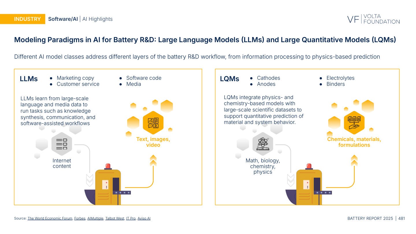 The report's own distinction between Large Language Models and Large Quantitative Models (p. 481) reinforces this. LLMs handle language, workflow, and knowledge synthesis. LQMs integrate physics and chemistry-based models with scientific datasets for quantitative prediction. Both matter. But the quantitative predictions that actually inform cell design, protocol optimization, and degradation forecasting require physics-based simulation grounded in real data. That is the layer Ionworks builds.